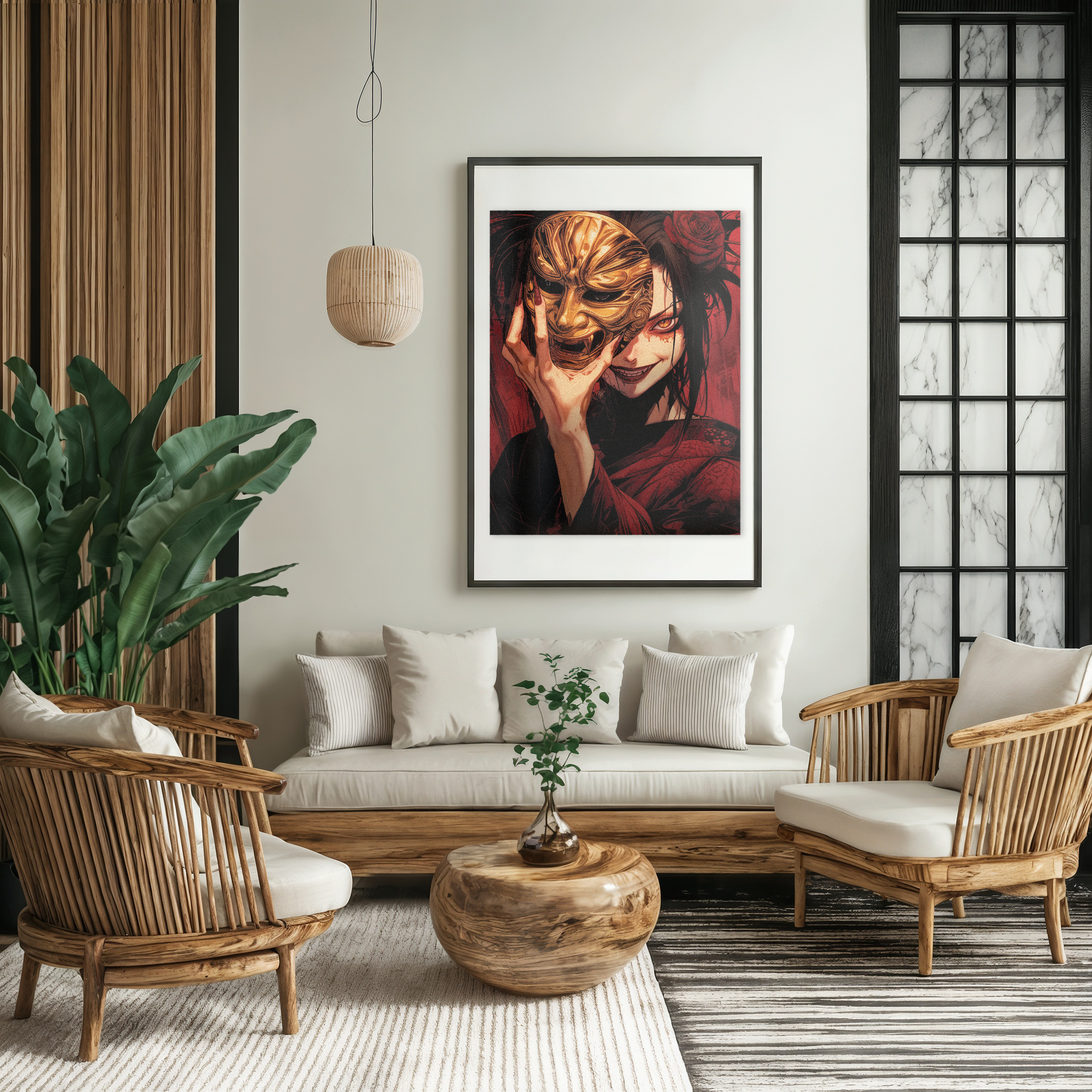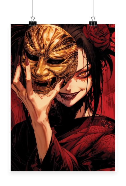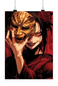 Przenieś się do mrocznego świata japońskich legend z tym niesamowitym plakatem. Gejsza w tradycyjnym kimono, trzymająca złotą maskę Oni, tworzy fascynujący kontrast między pięknem a tajemnicą.