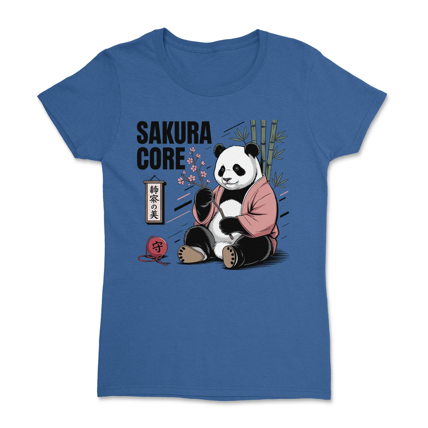 „Sakura Core” to projekt, który łączy w sobie delikatność japońskiej estetyki z subtelnym przekazem symbolicznym. W centrum grafiki znajduje się spokojna panda w tradycyjnym haori, trzymająca gałązkę kwitnącej sakury – symbolu piękna chwili, przemijania i równowagi. Obok niej pojawia się czerwony amulet omamori z kanji 守 („ochrona”), a całość dopełnia bambusowe tło oraz drewniana tabliczka z inskrypcją 静寂の美 („Piękno ciszy”).